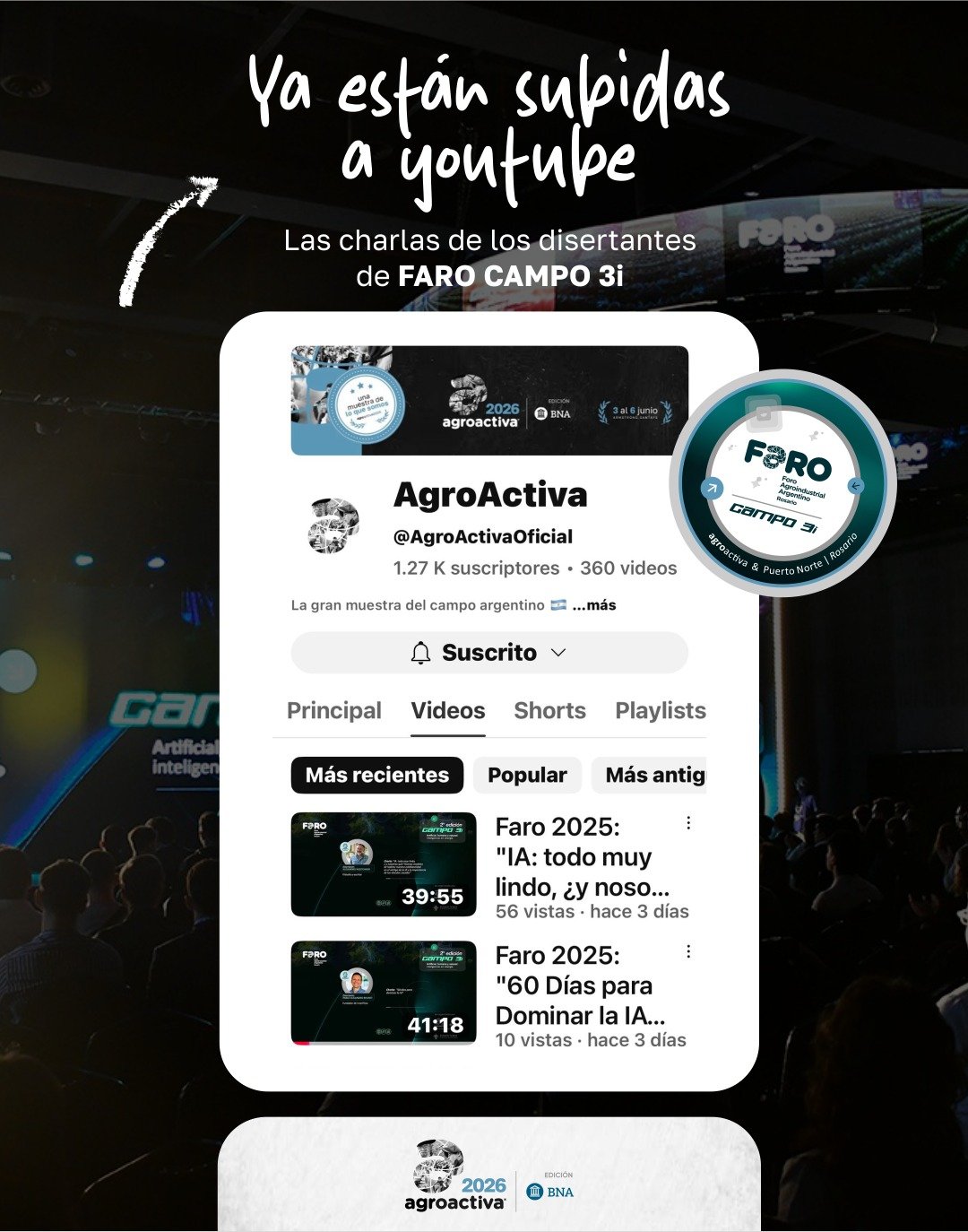 La jornada sobre IA aplicada al campo, organizada por Agroactiva y Puerto Norte, reunió a referentes, empresas y especialistas que hoy marcan el rumbo de la innovación agropecuaria. Desde hoy, todas las conferencias pueden verse completas y de manera gratuita en el canal oficial de YouTube.